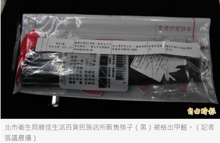 台北市衛生局今公布美耐皿類食品容器查驗結果,在30件抽驗產品中,勝佳生活百貨民族店所販售的筷子(黑),被檢驗出甲醛10.9ppm,