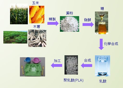 製造聚乳酸最有價值的反應是含澱粉的農作物,利用澱粉發酵法萃取的醣類,